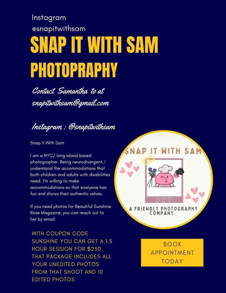 If your in the New York Area and would love to be featured in our Magazine and need new fresh photos contact Snap it with Sam and received a discount but make sure to let her know the photos are for Beautiful Sunshine Rose Magazines to receive the discount.
